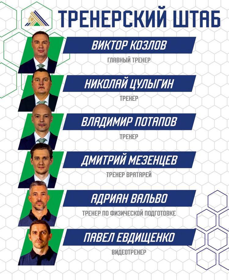 В штаб главного тренера Виктора Козлова вошли пять специалистов, все сохранили свои посты, обошлось без новичков. Продолжили работу: Николай Цулыгин – он отвечает за работу с защитниками в игре в меньшинстве, Владимир Потапов – отвечает за игру в большинстве и работу с молодыми хоккеистами, Дмитрий Мезенцев – тренер вратарей, Адриан Вальво – тренер по общей физической подготовке и Павел Евдищенко – видеотренер.