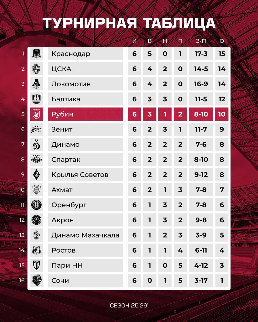 На счету казанцев – 10 очков. Разница забитых и пропущенных голов –2 (8–10). Выше «Рубина» расположились «Краснодар» (15 очков), ЦСКА (14), «Локомотив» (14) и «Балтика» (12). При этом ниже казанцев расположились топ-клубы, среди которых – «Зенит» (9), московское «Динамо» (8) и «Спартак» (8).