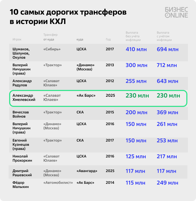 «БИЗНЕС Online» собрал десятку самых дорогих трансферов в истории КХЛ. На каком месте будет Хмелевский?