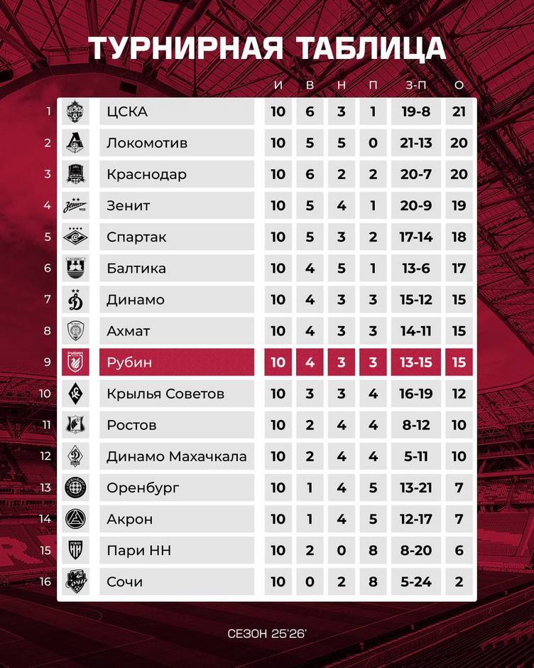 В чемпионате России сменился лидер, «Рубин» опустился на 9-е место