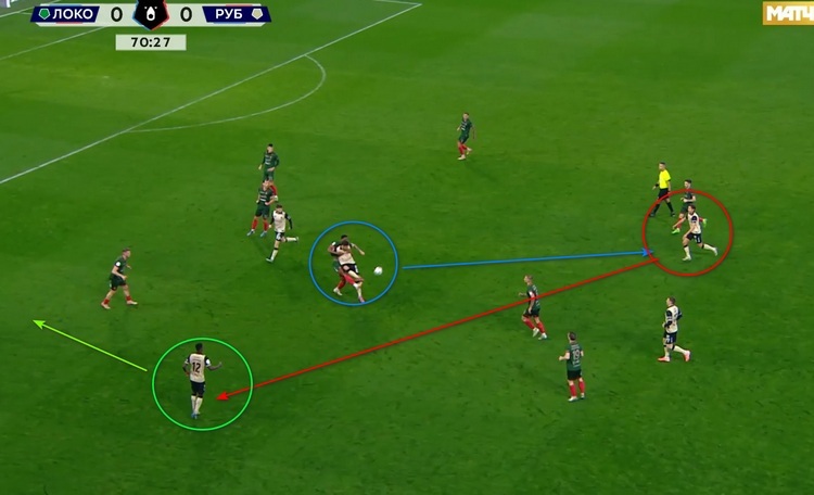 Еще пару слов о заменах и перестановках: когда команда стала проигрывать, Рахимов выпустил креативного Александера Юкича, но по традиции, пользы он не принес, зато сработал перевод Арройо в полузащиту, именно с позиции флангового полузащитника он сделал свою голевую передачу. В этот момент «Рубин» перешел на игру в четыре защитника: Илья Рожков вернулся на левый фланг обороны, а двумя центральными защитниками остались Игор Вуячич и Егор Тесленко. Позже Рахимов снял с игры Рожкова и отправил в центр поля Олега Иванова, Арройо вновь отправился на край обороны, а Юкич переместился на фланг. Плодов это не принесло, но видно, что наставник теперь имеет вариативность и может перестроиться в случае необходимости.