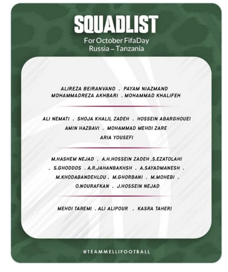 Сборная Ирана опубликовала список игроков, вызванных на тренировочный сбор и предстоящий товарищеский матч против сборной России.