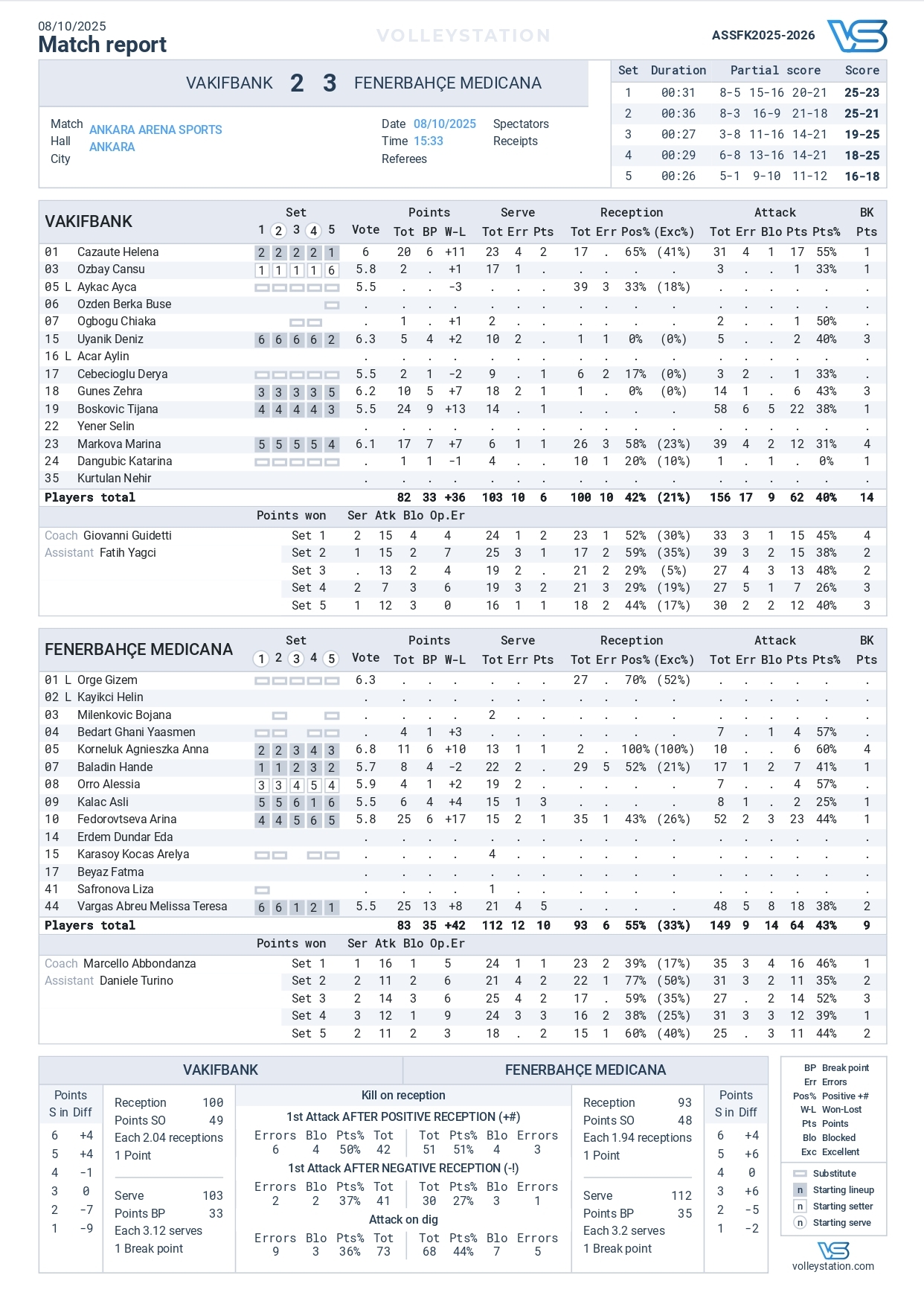 Российская доигровщица «Вакифбанка» Марина Маркова набрала 17 очков (7 брейков, +7). Она забила 12 из 39 мячей (31%, 5 потерь), оформила один эйс и поставила четыре блока – столько же у центральной «Фенербахче» Агнешки Корнелюк. В приёме у Марковой 58% позитивной доводки и три ошибки при 26 действиях.
