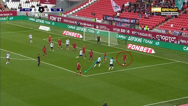 Пока Далер провел только два матча в составе «Рубина», и видно, что ему не хватает физических кондиций. Однако в матче против «Крыльев Советов» он компенсировал это подсказками партнера, открываниями и борьбой. В качестве примера можно разобрать эпизод с теми же самарцами. Россиянин оказался под прессингом двух игроков соперника, самое простое решение в этой ситуации было – выбить мяч за боковую, но Далер не стал так поступать и элегантным черпачком нашел Йочича.