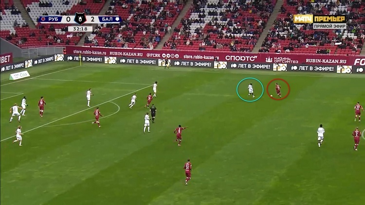 Можно рассмотреть и другой момент: казанцы снова владеют мячом, который доставили до Алексея Грицаенко, но и у него нет адресата для дальней передачи, а из-за прессинга пришлось отдавать на Дмитрия Кабутова, которого еще до приема мяча бежал накрывать Мингиян Бевеев. В итоге, игроку казанцев пришлось выносить его без адресата. Впереди Даку снова проиграл борьбу Кевину Андраде, и «Рубин» остался в атаке ни с чем. Хотя, если бы у казанцев была отлажена игра по выходу из под прессинга, то Дмитрий мог спокойно отдавать пас на стоящего рядом Дардана Шабанхаджая.