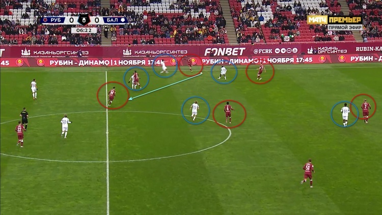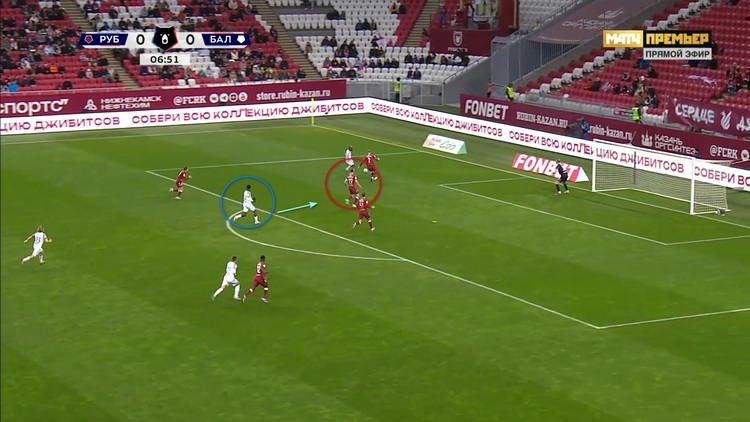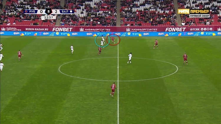 По первым минутам игры казалось, что казанцы вообще к такому не готовились. Гости накрывали хозяев поля из раза в раз. В качестве примеров можно разобрать несколько эпизодов из старта матча. Вот казанцы разыгрывают мяч от своих ворот: его получает Илья Рожков и тут же попадает под прессинг Максима Петрова. При этом, у казанца нет очевидного адресата для передачи вперед – на Велдине Ходже уже висел игрок «Балтики», Далер Кузяев находится очень далеко, как и Угочукву Иву, поэтому пришлось отдавать назад Егору Тесленко, а того стал накрывать Брайан Хиль. Россиянин тоже ничего не придумал и пульнул мяч вперед, Мирлинд Даку не смог зацепиться, и уже последовала потеря.