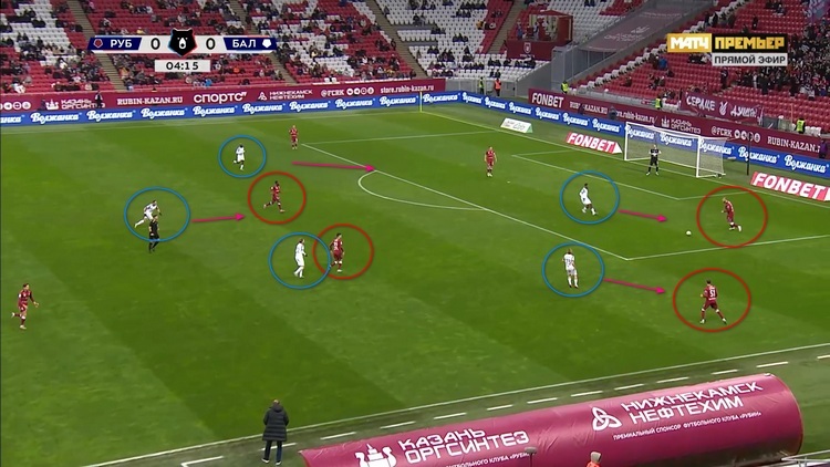 Интересно, что «Рубин» уже играл с командой, которая играет в похожем стиле, что и «Балтика», и это был ЦСКА. Тогда казанцы тоже плохо выходили из под прессинга армейцев, в результате чего и получили пять пропущенных мячей. Причины, почему подопечные Рахимова плохо выходят из под давления, объяснил экс-футболист «Рубина» Алексей Попов: «У «Рубина» нет цели владеть мячом. Это и есть главная проблема. Команда не играет агрессивно на своей половине поля. Казанцы не строят свою игру через короткий пас, а действуют только через забросы. Отсюда и возникают сложности по выходу из под прессинга».