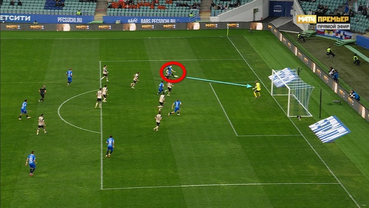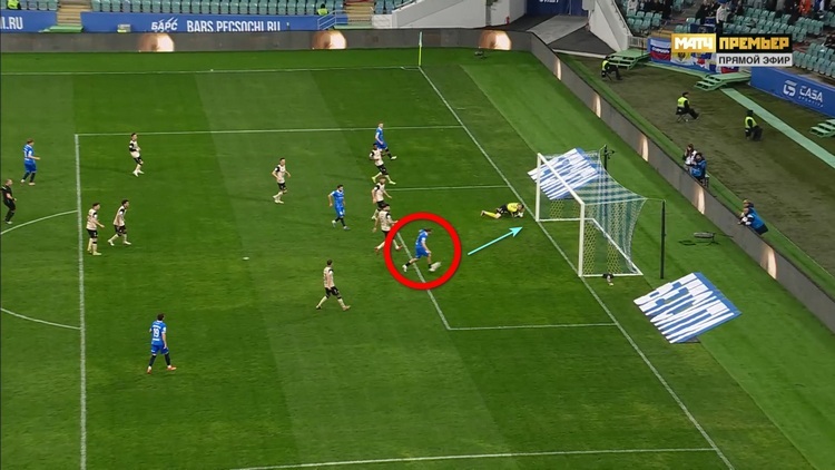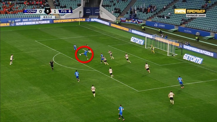Эпизод у ворот «Рубина» возник ближе к середине второго тайма. Сочинцы явно перехватили инициативу и стали атаковать активнее, чем в первом тайме. Так, они начали развивать атаку со своей половины поля и быстро доставили мяч к чужим воротам.