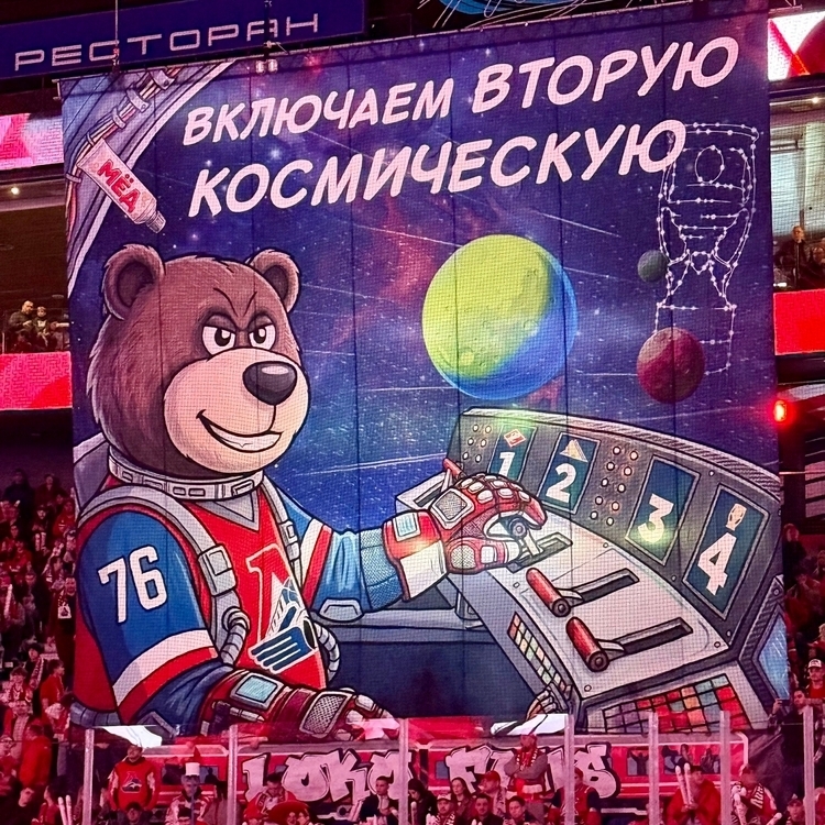 Перед стартовой сиреной на арене было световое шоу, его в хоккейной форме проводила группа поддержки. Фан-сектор вывесил плакат с изображением Мишки – талисмана «Локомотива» и подписью «включаем вторую космическую». Медведь взялся за второй рычаг, а всего их четыре. Здесь идёт аналогия между четырьмя раундами Кубка Гагарина и космическими скоростями.