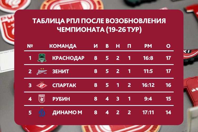 После поражения от махачкалинского «Динамо», которое был в туре после возобновления, казанцы набрали сразу 15 очков. По их количеству команда уступает только «Краснодару» (17 очков), «Зениту» (17) и «Спартаку» (16). Шикарный показатель, учитывая, что это команды с многомиллионными составами. При этом «Рубин» обошел московское «Динамо» (14), «Локомотив» (12) и «Балтику» (11), которой все так восхищаются. Вместе с этим, результатами удивляет ЦСКА. Армейцы напрочь провалили весну, набрав лишь восемь баллов.