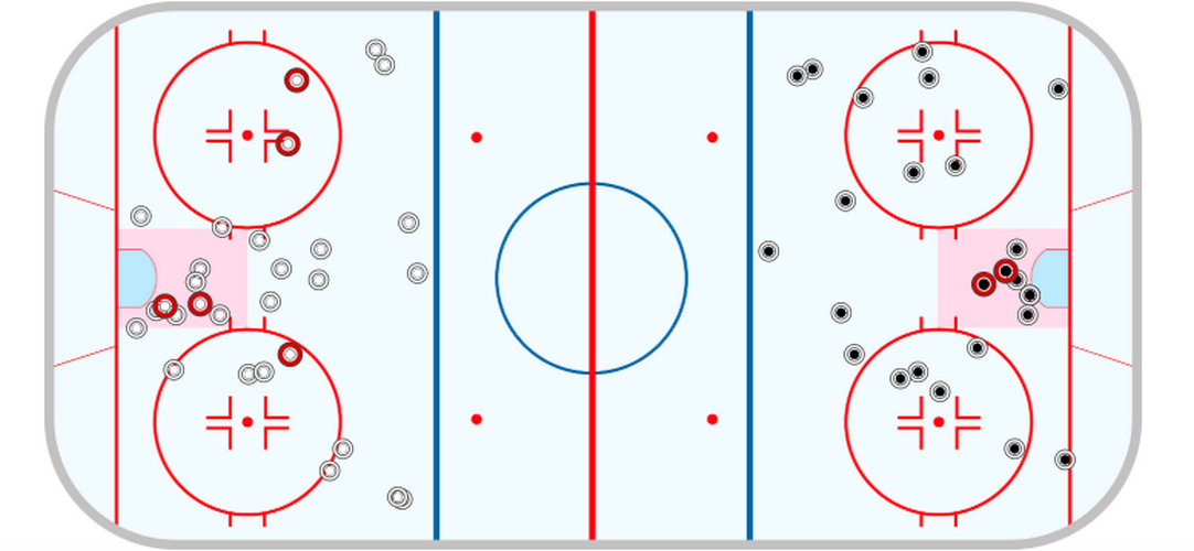 Вывод после первого матча один: философия «Ак Барса» победила. Казанцы вчистую выиграли чужой пятачок за счёт своих габаритных и силовых нападающих, не пустили соперника на свой и выиграли борьбу за нейтральные шайбы. А ещё обратите внимание, откуда обе команды наносили броски: как много попыток у «Ак Барса» в непосредственной близости к чужим воротам, тогда как у «Металлурга» – с кругов вбрасывания. Слева – броски «Ак Барса», справа – броски «Металлурга».