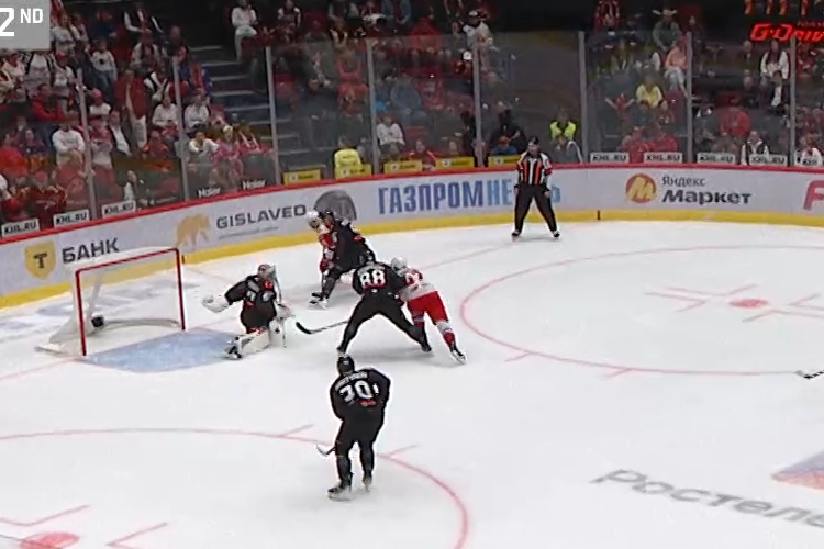 Защита «Авангарда» во второй раз подряд проморгала Радулова в самой опасной зоне на льду. Звёздный игрок даже в 39 лет не потерял молниеносной реакции. Посмотрите как Радулов (№47) нашёл шайбу в окружении сразу трёх соперников.